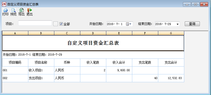 显示指定月份内各账户的上期余额、本期收入、本期支出、本期余额及各数据合计
