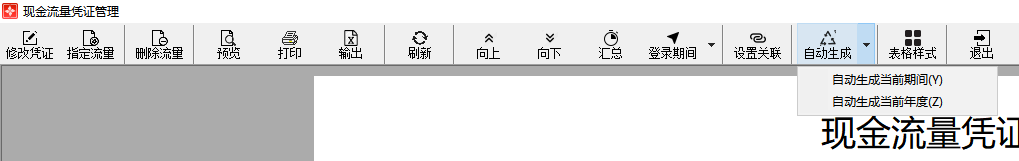 软件主界面的菜单列,点击〖现金流量〗 —〖现金流量凭证管理〗,在‘现金流量凭证管理’界面,点击〖自动生成〗。如图 3 :